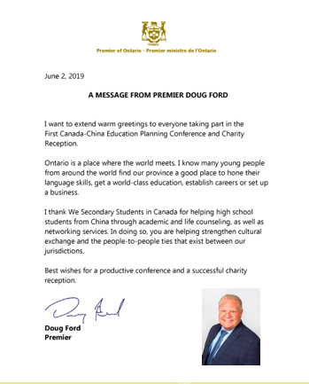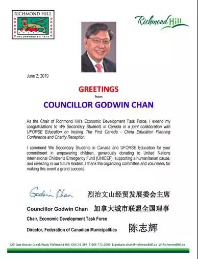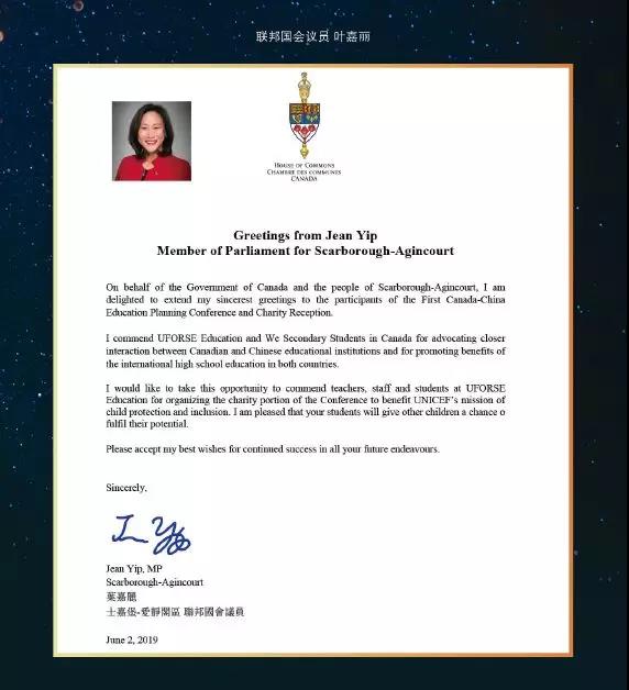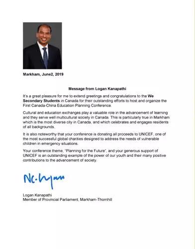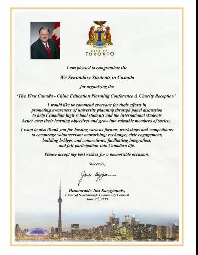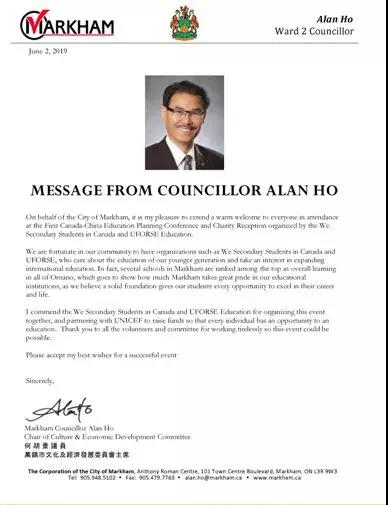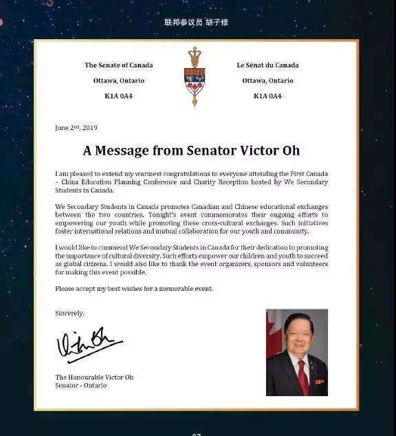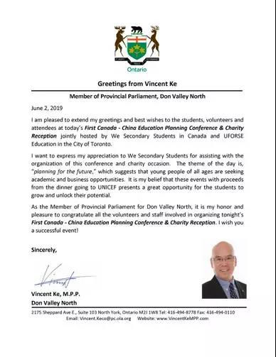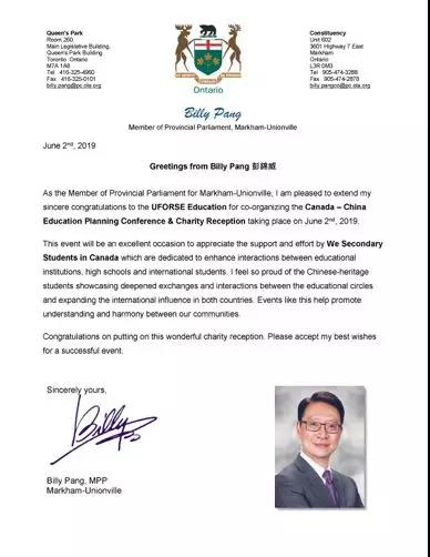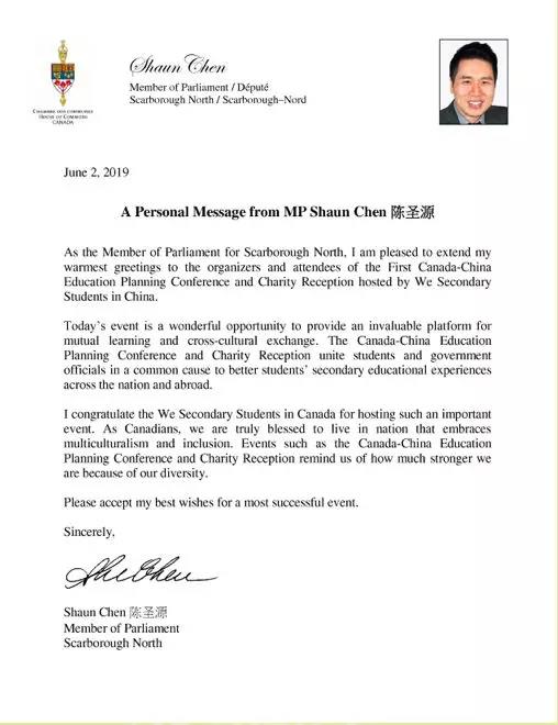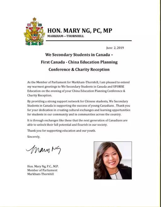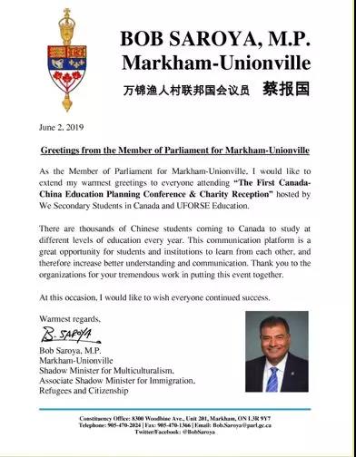 联邦参议员胡子修、联邦国会议员伍凤仪、联邦国会议员陈圣源、联邦国会议员叶嘉丽、联邦国会议员马万里、联邦国会议员蔡报国、安省省议员韦邱佩芳、安省省议员Logan Kanapath、安省省议员彭锦威、安省省议员柯文斌、多伦多市议员詹嘉礼、万锦市议员何胡景、列治文山市议员陈志辉等也为本次研讨会发来了贺信,祝贺英狮教育与WSSC加拿大高中校友联谊会秉持着为更多留学生奉献和理念和态度,在未来越办越好!